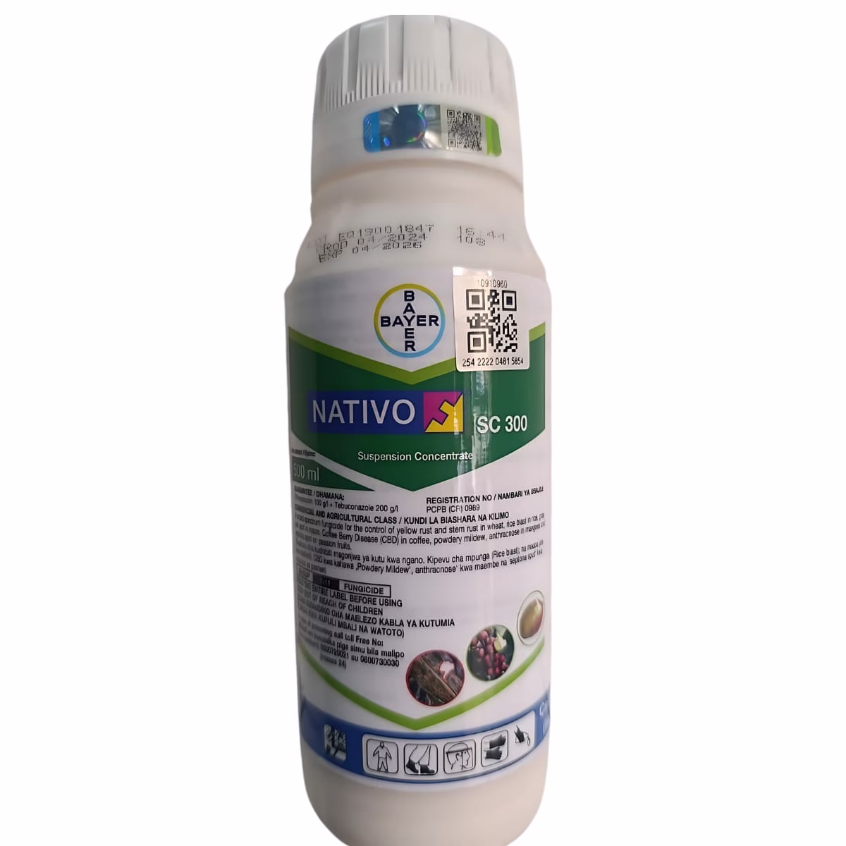 NATIVO SC 300 is a foliar fungicide for the control of rust disease in wheat, rice blast in rice; Grey Leaf Spot on Maize, Coffee berry disease (CBD) in coffee and anthracnose, powdery in mangoes and septoria spots in passion fruits. The combination of two active ingredients substance which makes its highly effective and manage resistance.